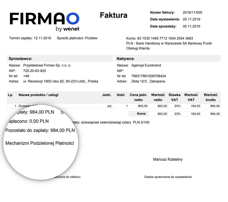 Po wygenerowaniu takiej faktury, w jej podglądzie i na wydruku będziesz widział adnotację, że jest to faktura z Mechanizmem Podzielonej Płatności.
