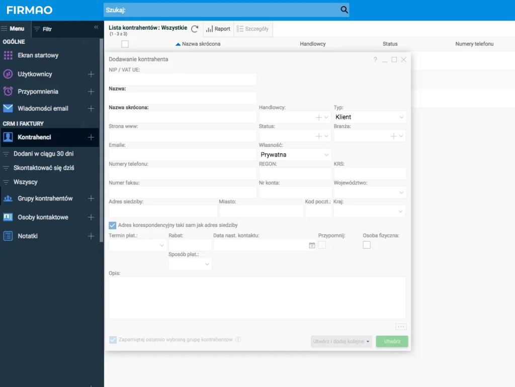 System CRM online oferuje nam możliwość wprowadzenia wszystkich potrzebnych danych klienta, m.in. nazwę kontrahenta, adres firmy, e-mail, numer kontaktowy. Im więcej mamy do dyspozycji informacji o naszym kliencie tym łatwiej możemy np. wystawiać dla niego faktury, ponieważ wiele danych zostaje wtedy automatycznie uzupełnionych. Dzięki wprowadzeniu wielu danych możemy także filtrować kontrahentów na przykład ze względu na województwo czy branżę w jakiej działa firma. Będzie to szczególnie pomocne w akcjach marketingowych nakierowanych na daną branżę lub region.