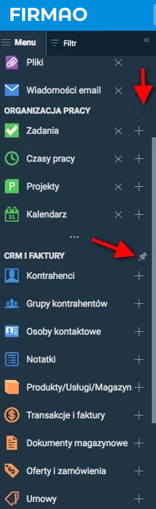 System CRM składa się z różnych modułów, które oferują wiele funkcji. Nie w każdej firmie wszystkie dostępne funkcje są potrzebne do codziennej pracy. Firmao jako przykład systemu CRM dzięki funkcji przypinania i odpinania poszczególnych modułów i ich zawartości każdy użytkownik może dostosować wygląd systemu do swoich potrzeb. Dzięki temu pracownik nie będzie marnował czasu na przewijanie Menu w celu znalezienia potrzebnej sekcji. Po spersonalizowaniu jego wygląd będzie dostosowany do potrzeb konkretnego pracownika. Dodatkowo każdy pracownik ma także możliwość dostosowywania swojego ekranu startowego w programie, dzięki czemu najważniejsze informacje takie jak np. zaplanowane zadania w kalendarzu czy nowe e-maile zawsze będą widoczne na początku pracy.