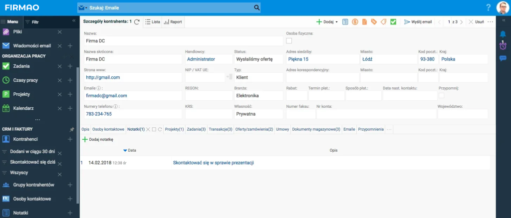 Podstawowym celem każdego systemu CRM jest efektywne zarządzanie relacjami z klientami. Mogą występować w różnych formach jak np. spotkania z klientem, korespondencje e-mail i rozmowy telefoniczne. Korzystanie z systemu ma w szczególności poprawić skuteczność zarządzania tymi relacjami. To działanie będzie przynosiło korzyści tylko w chwili, gdy kontakty będą skrupulatnie planowane i ewidencjonowane. W systemie Firmao CRM mamy możliwość planowania zadań, nawiązywania kontaktów i innych aktywności dotyczących relacji z klientem za pomocą różnych narzędzi. Planowanie zadań w szczególności ułatwią nam takie narzędzia jak Kalendarz i Przypomnienia. Ponadto dzięki opcji przypisywania maili do danego kontrahenta cała korespondencja dostępna jest w jednym miejscu i mają do niej dostęp wszyscy uprawnieni pracownicy. Ma to szczególne znaczenie w firmach, gdy obsługą jednego klienta zajmuje się cały zespół pracowników.