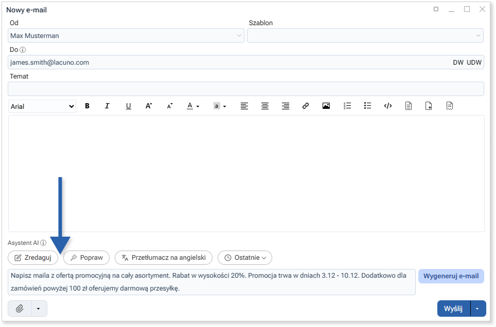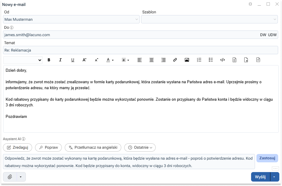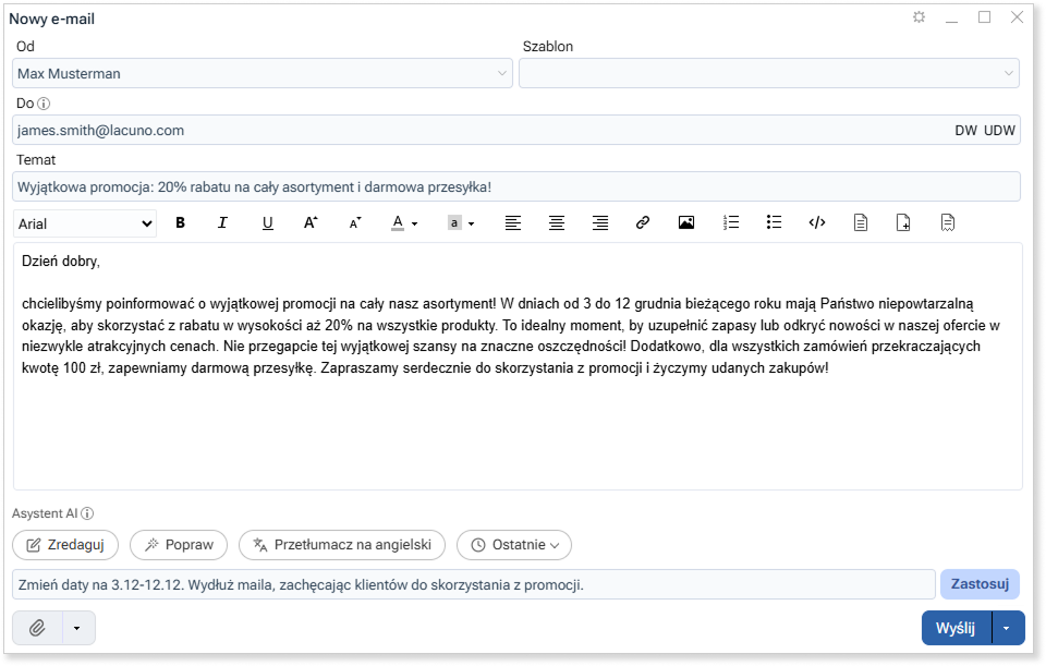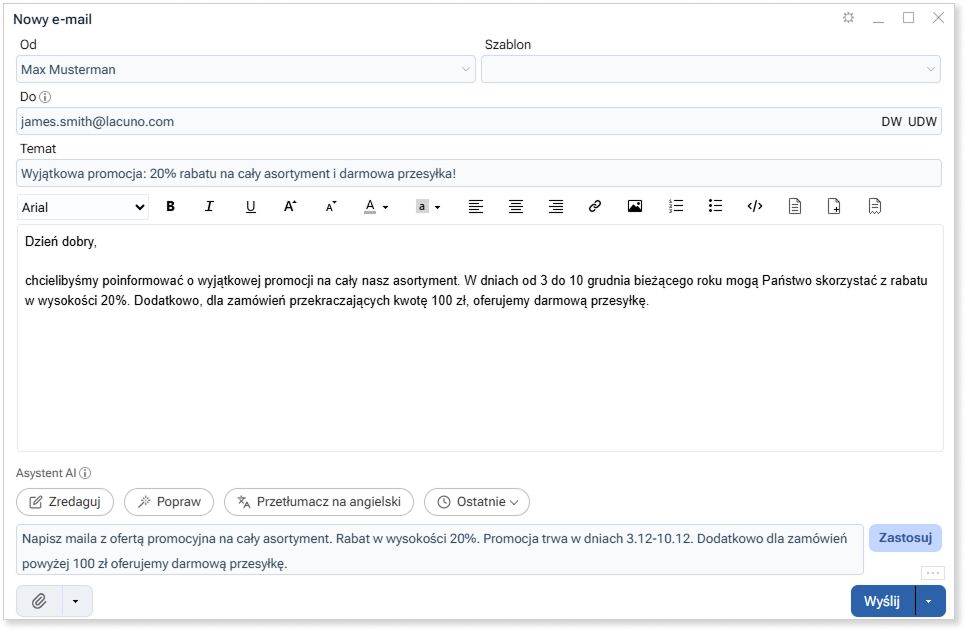 - Język wiadomości: e-mail zostanie wygenerowany w takim języku, w jakim pisałeś do wybranego klienta w przeszłości.