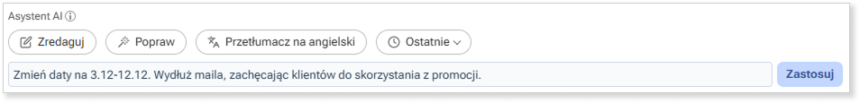 Wszelkie zmiany, które chcesz wprowadzić w tej wiadomości możesz robić ręcznie lub ze wsparciem AI. W przypadku drugiej opcji wpisz w to samo pole „Asystent AI”, co chcesz zmienić w wygenerowanej treści. Może to być jej ton, długość, informacje, słownictwo, zwroty oraz inne aspekty, które chciałbyś zmienić.