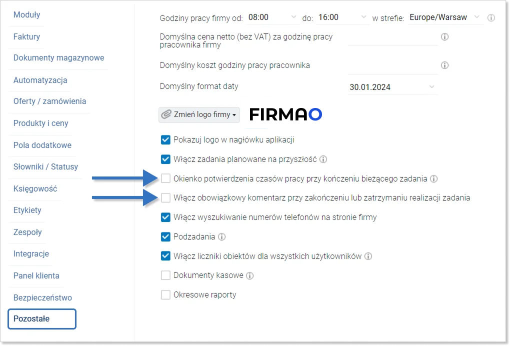 W Firmao możesz ustawić, aby przy pauzowaniu lub kończeniu aktualnego zadania wyświetlało się dodatkowe okno oraz aby był wymagany komentarz do zadania. W tym celu przejdź do ustawień firmy, a następnie wybierz „Pozostałe” w lewym panelu nawigacyjnym i zaznacz pole „Okienko potwierdzenia czasów pracy przy kończeniu bieżącego zadania” oraz/lub pole „Włącz obowiązkowy komentarz przy zakończeniu lub zatrzymaniu realizacji zadania”.