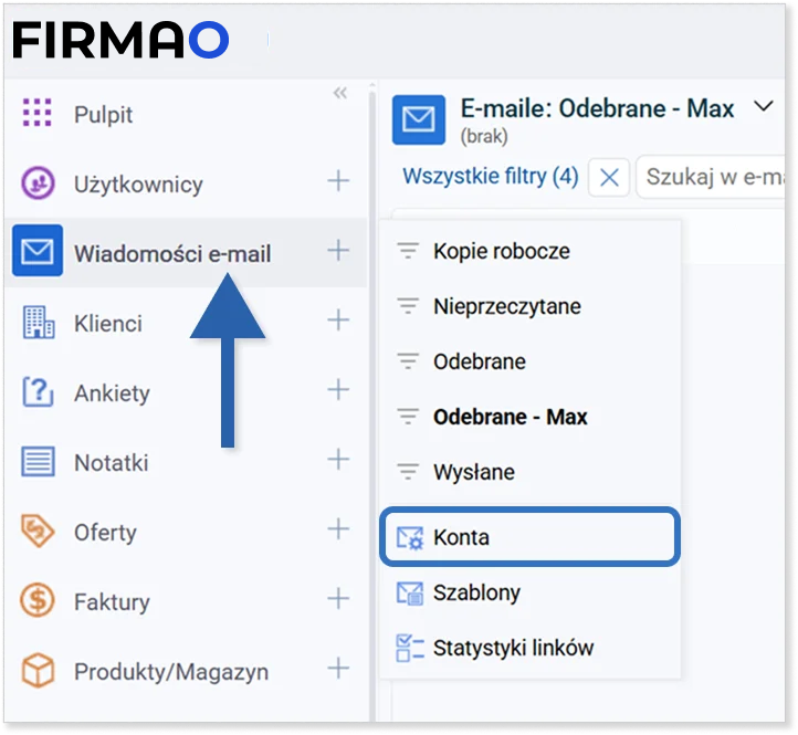 Klienci mogą dodawać się automatycznie na podstawie wiadomości e-mail, jeśli adres nadawcy w otrzymanej wiadomości nie jest przypisany do żadnego klienta istniejącego w Twojej bazie. W celu włączenia tej opcji kliknij strzałkę skierowaną w dół po prawej stronie modułu „Wiadomości e-mail” w menu głównym, a następnie z listy rozwijanej wybierz „Konta”.
