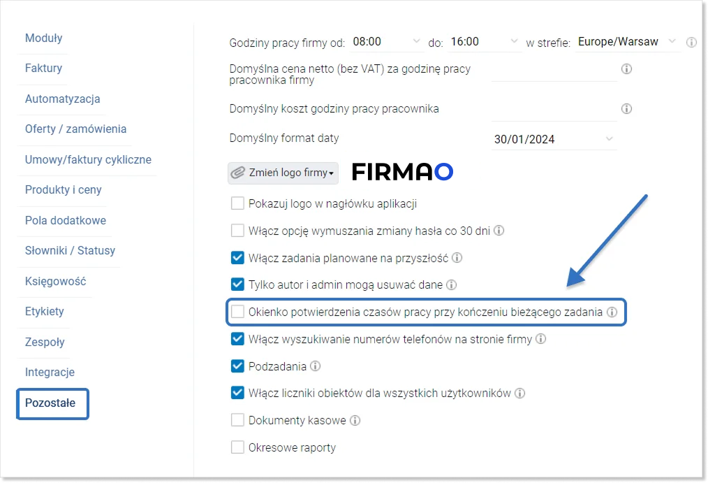 W Firmao możesz ustawić, aby wyświetlało się dodatkowe okno przy pauzowaniu lub kończeniu aktualnie wykonywanego zadania. W tym celu przejdź do ustawień firmy, a następnie wybierz „Pozostałe” w lewym panelu nawigacyjnym i zaznacz pole „Okienko potwierdzenia czasów pracy przy kończeniu bieżącego zadania”.