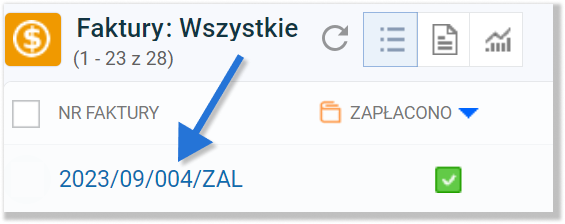 Ważne! Aby wystawić kolejną fakturę zaliczkową, poprzednia musi być oznaczona jako „Zapłacono”. W celu oznaczenia faktury zaliczkowej jako opłacona, przejdź do jej panelu szczegółów i zaznacz pole „Zapłacono”.