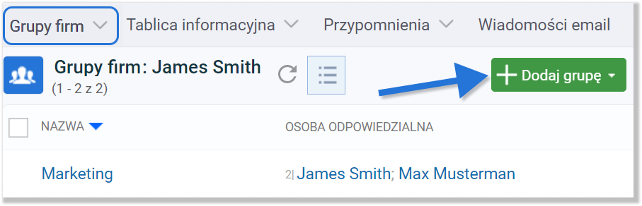W systemie Firmao każdy z użytkowników może posiadać własną indywidualną grupę firm oraz może być przypisany do wspólnej grupy. Jest to funkcjonalność pozwalająca ustalić grupy lub osoby odpowiedzialne za firmę dodaną do systemu. Grupy firm widoczne są w szczegółach danej firmy jako pole „Osoba odpowiedzialna”.