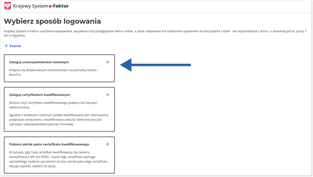 KSeF poprosi Cię o wybór sposobu logowania. Wybierz „Zaloguj uwierzytelnieniem testowym”.