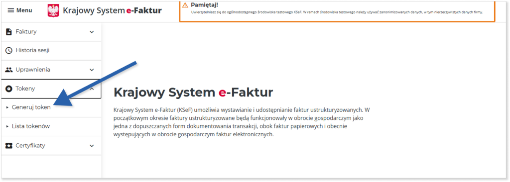 Po wprowadzeniu danych kliknij przycisk „Uwierzytelnij do aplikacji testowej”. System przeniesie Cię do strony głównej. W lewym menu kliknij „Tokeny”, a następnie wybierz „Generuj token”.