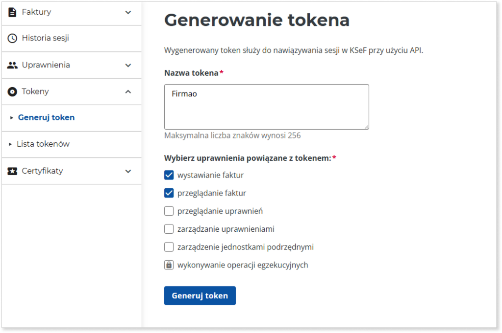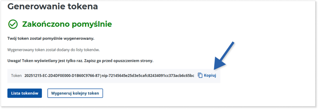 Ważne! Numer tokena wyświetlany jest tylko raz. Zapisz go przed opuszczeniem strony.