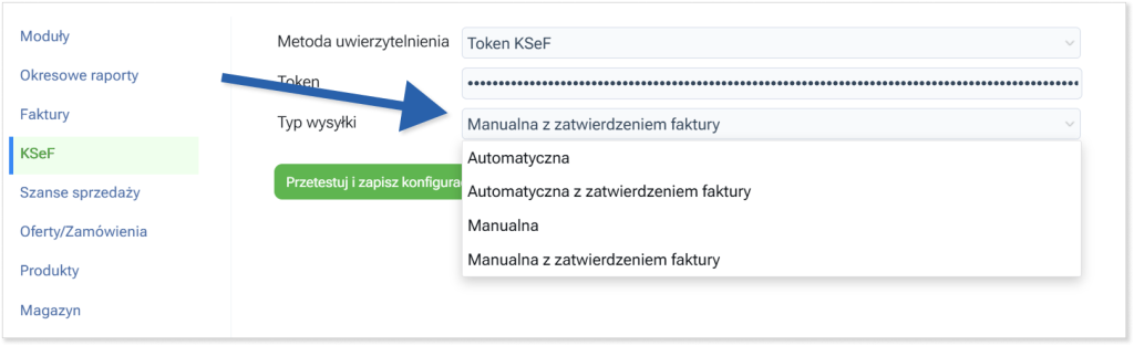 Następnie kliknij KSeF w lewym panelu bocznym i w pole „Token” wklej skopiowany token ze strony KSeF. W polu Typ wysyłki wybierz jedną z czterech opcji: