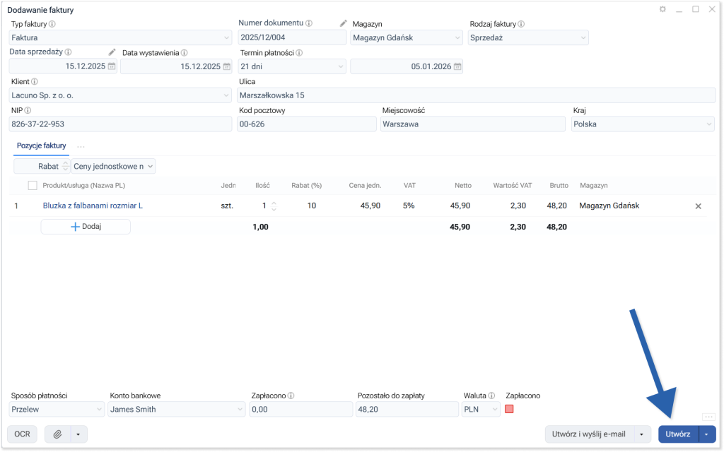 Kliknij „Faktury” w menu głównym. Następnie kliknij niebieski przycisk „Dodaj” w prawym górnym rogu. Uzupełnij dane faktury w nowo otwartym oknie, a następnie kliknij niebieski przycisk „Utwórz”.