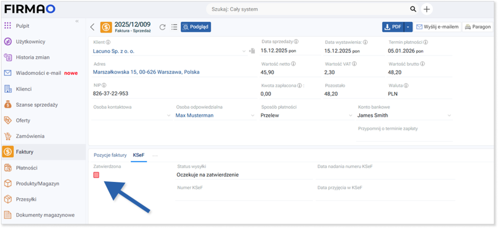 Następnie przejdź do szczegółów utworzonej faktury i kliknij zakładkę „KSeF”. Kliknij pole „Zatwierdzona”.