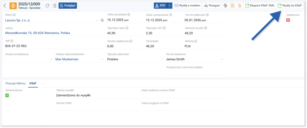 Następnie przejdź do szczegółów utworzonej faktury i kliknij przycisk „Wyślij do KSeF” w górnym pasku. Faktura zostanie przesłana do KSeF.