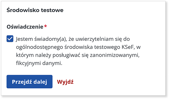 Następnie zaznacz pole w oświadczeniu o środowisku testowym, potwierdzając, że dane wprowadzane są do środowiska testowego KSeF są zanonimizowane, fikcyjne.