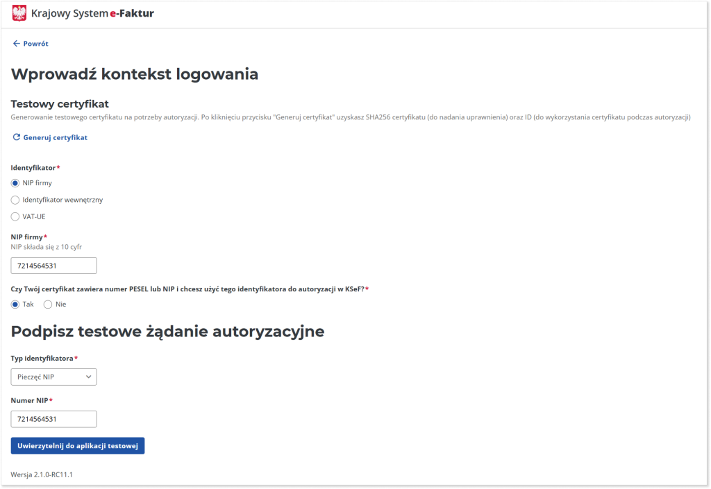 W kolejnym kroku wprowadź kontekst logowania, czyli identyfikator i podpisz testowe żądanie autoryzacyjne. Pamiętaj, aby wprowadzone dane były fikcyjne.