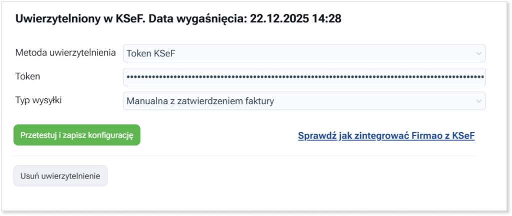 Po wprowadzeniu danych kliknij przycisk „Przetestuj i zapisz konfigurację„. Jeśli konfiguracja przebiegła pomyślnie, nad oknem konfiguracji pojawi się informacja: „Uwierzytelniony w KSeF. Data wygaśnięcia: ….”. Data wygaśnięcia wynosi 7 dni od konfiguracji na koncie w środowisku testowym.