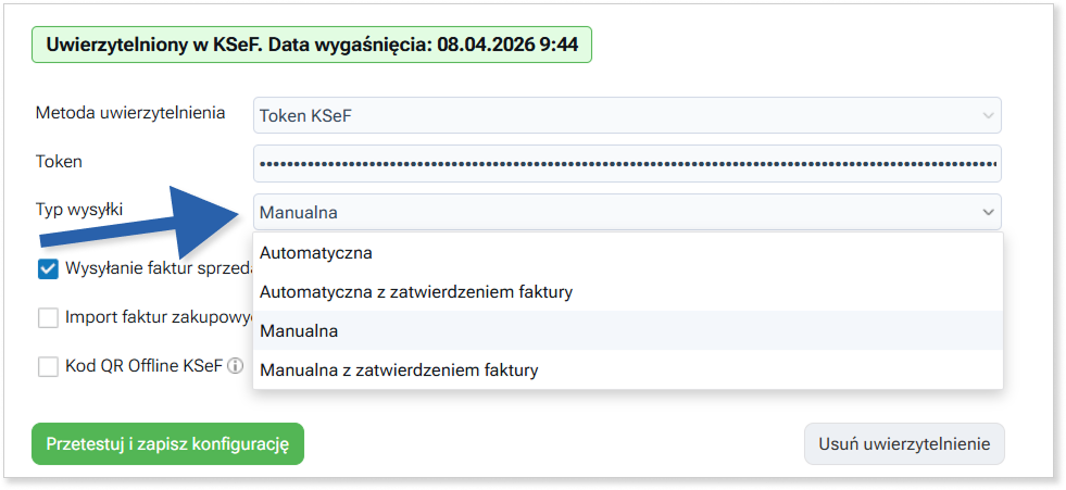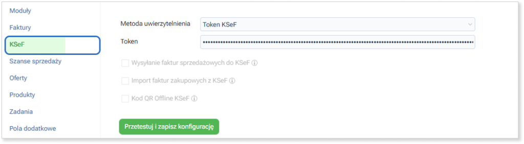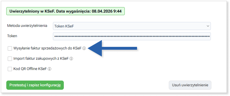 Po wprowadzeniu danych kliknij przycisk „Przetestuj i zapisz konfigurację„. Jeśli konfiguracja przebiegła pomyślnie, nad oknem konfiguracji pojawi się informacja: „Uwierzytelniony w KSeF. Data wygaśnięcia: ….”.