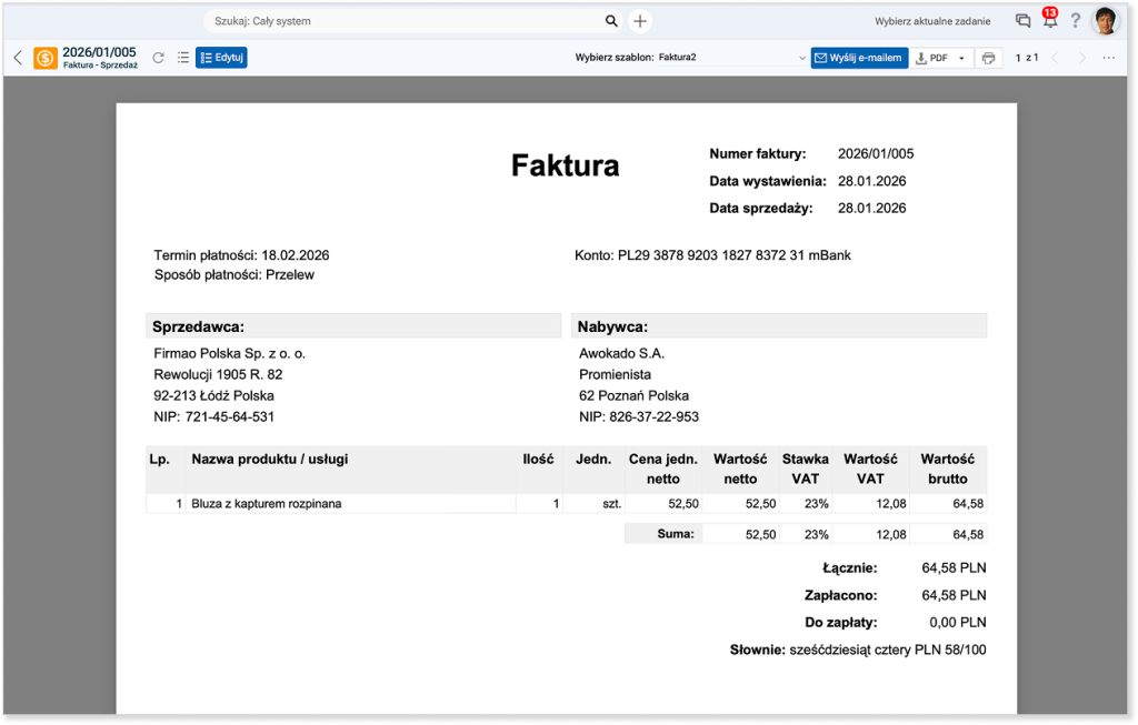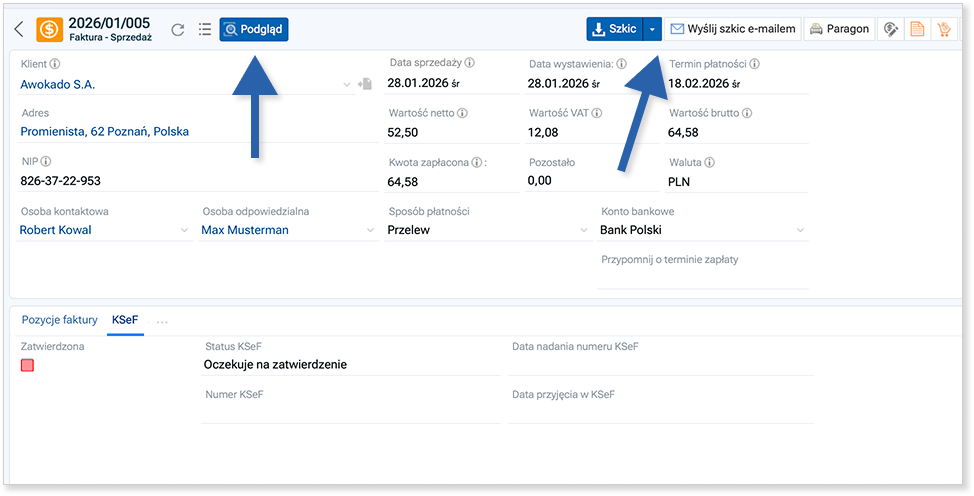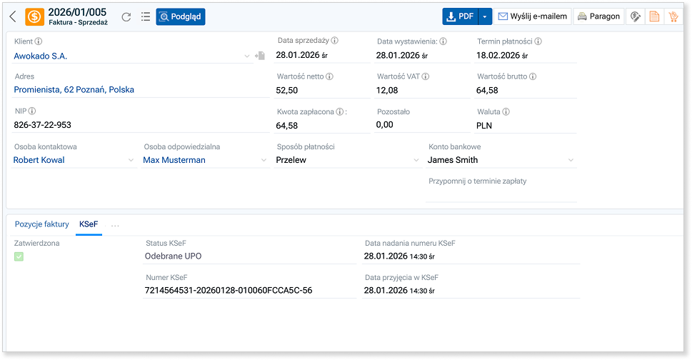 Po zatwierdzeniu faktury i przesłaniu jej do KSeF, poprawnie utworzony dokument otrzyma status Odebrane UPO oraz numer KSeF. Wtedy faktura straci status dokumentu roboczego i stanie się dokumentem z mocą prawną.