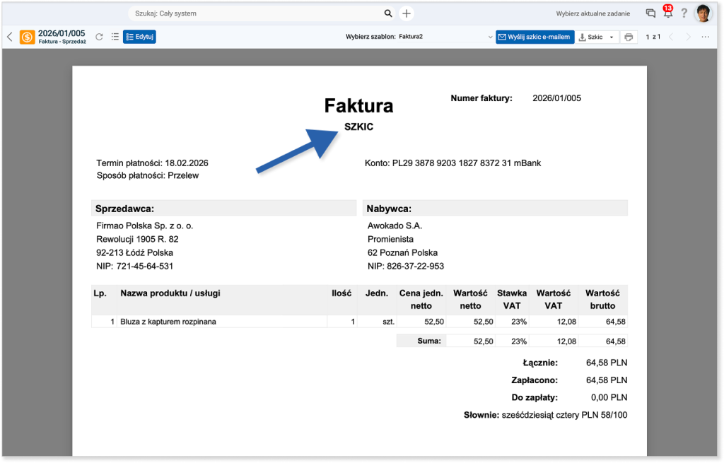 Napis „SZKIC” znajduje się pod tytułem dokumentu, w tym przypadku pod „Faktura” w jego górnej części.