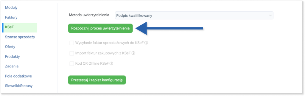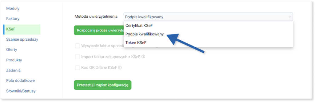 Kliknij zakładkę KSeF po lewej i wybierz metodę uwierzytelnienia: Podpis kwalifikowany.
