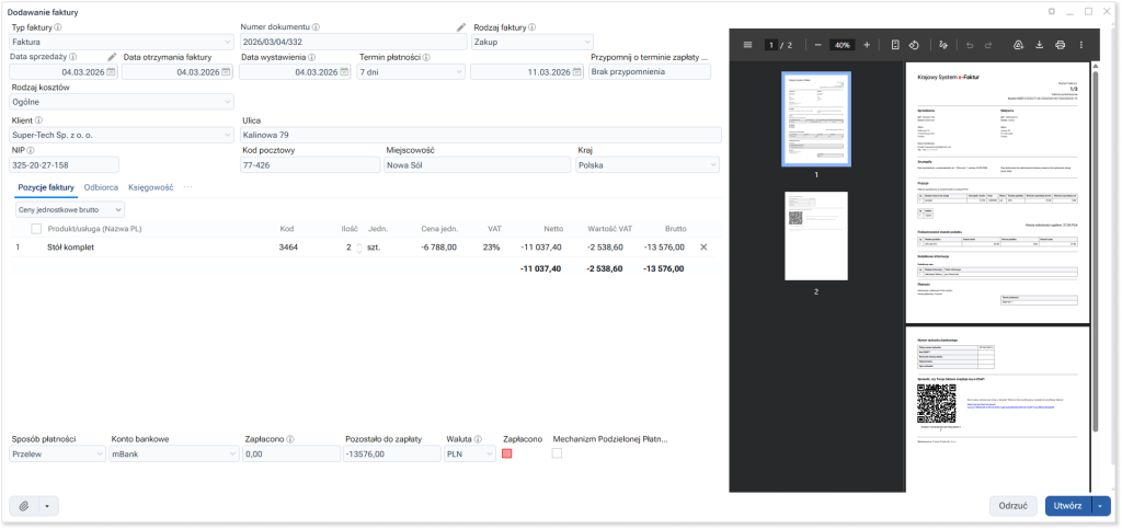 Otworzy Ci się okno dodawania faktury zakupowej, które będzie uzupełnione danymi pobranymi z KSeF i kliknij niebieski przycisk Utwórz, jeśli dane są prawidłowe.