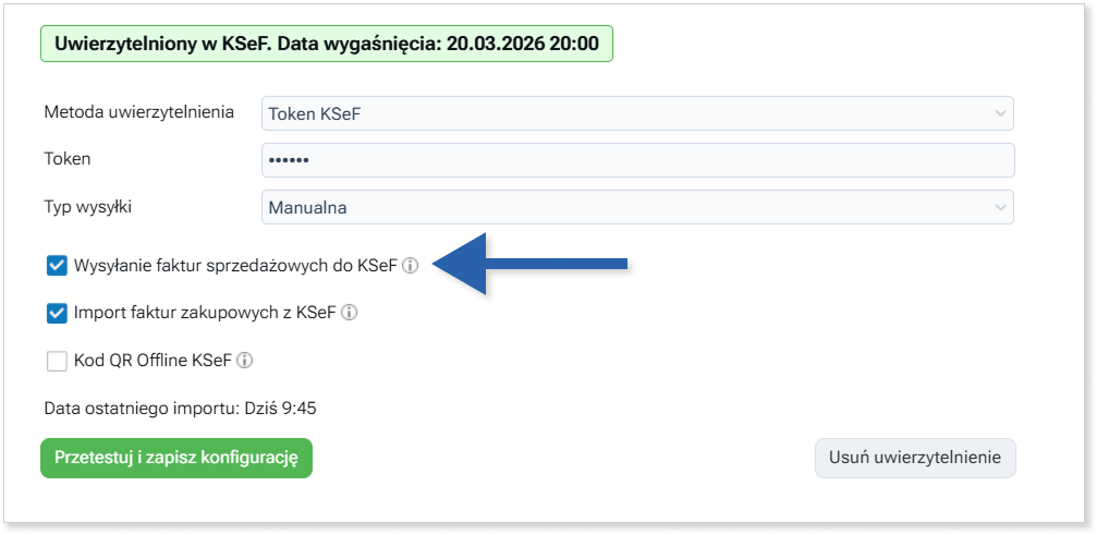 Wskazówka: Faktury wystawione po ustawieniu wysyłki do KSeF do momentu uzyskania statusu Odebrane UPO będą przekształcone w szkic faktury.