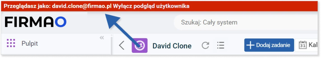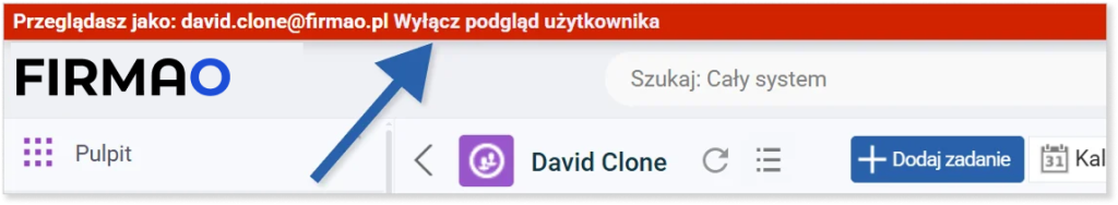 W każdym momencie możesz wyjść z widoku konta innego użytkownika. W tym celu na czerwonym pasku kliknij opcję „Wyłącz podgląd użytkownika”. Spowoduje to ponowne zalogowanie się na Twoje domyślne konto.