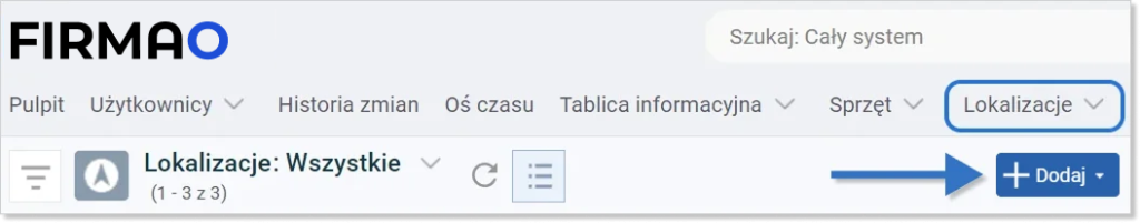 W celu dodania lokalizacji sprzętu przechodzimy do modułu „Lokalizacje” w górnym menu. Następnie klikamy niebieski przycisk „+ Dodaj” w prawym górnym rogu ekranu.