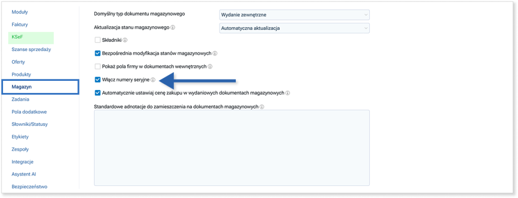 Z lewej strony kliknij zakładkę Magazyn i zaznacz pole „Włącz numery seryjne”.