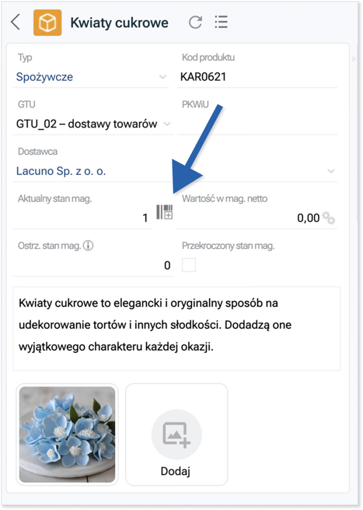 Ikonę serii znajdziesz z prawej strony pola Aktualny stan mag. w przypadku posiadania jednego magazynu: