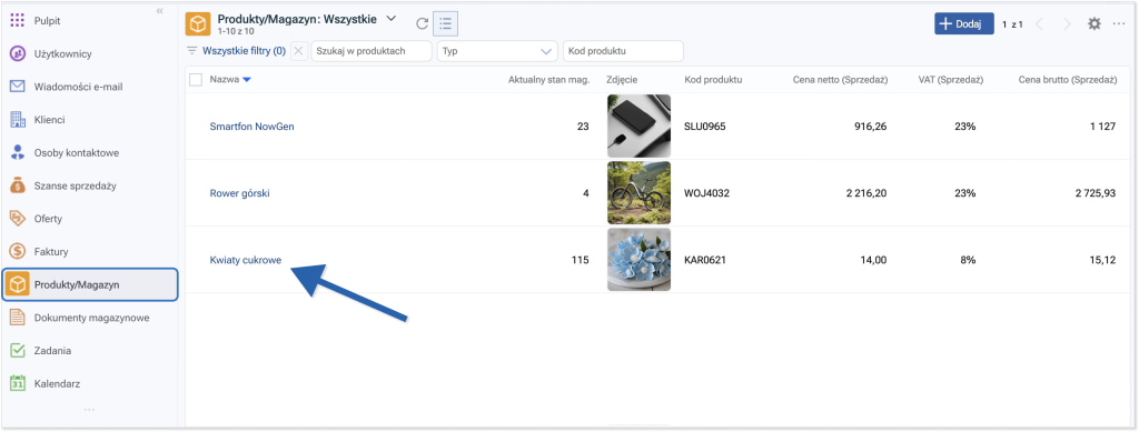 W tym celu kliknij Produkty/Magazyn w lewym menu głównym, a następnie kliknij nazwę produktu, którego informacje chcesz sprawdzić.