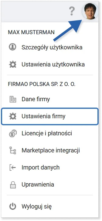 W celu włączenia funkcji numerów seryjnych i dat ważności, kliknij awatar w prawym górnym rogu, a następnie wybierz Ustawienia firmy.