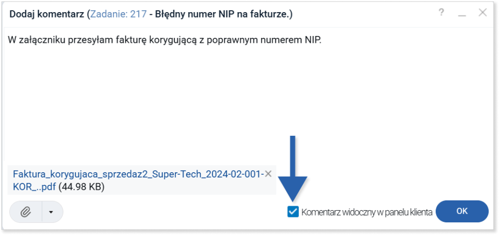 Jeśli posiadasz włączony Panel Klienta, możesz udostępnić komentarz jednocześnie w opisie zadania w systemie Firmao, jak i w Panelu Klienta. W tym celu zaznacz pole wyboru „Komentarz widoczny w panelu klienta”, które znajduje się w prawym dolnym rogu obok przycisku „OK”.