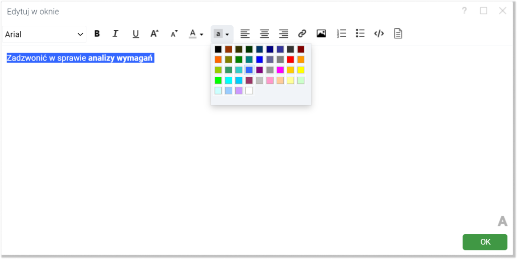 Wskazówka: Domyślnie na koncie demo możliwość formatowania tekstu jest wyłączona. Możesz ją włączyć, klikając w ikonę oznaczoną literą „A” w prawym dolnym rogu nad niebieskim przyciskiem „OK”. W oknie edycji opisu pojawi się edytor WYSIWYG.