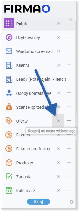 Kliknij przycisk Ukryj w celu zapisania zmian po ukryciu/podpięciu pozycji do menu głównego.