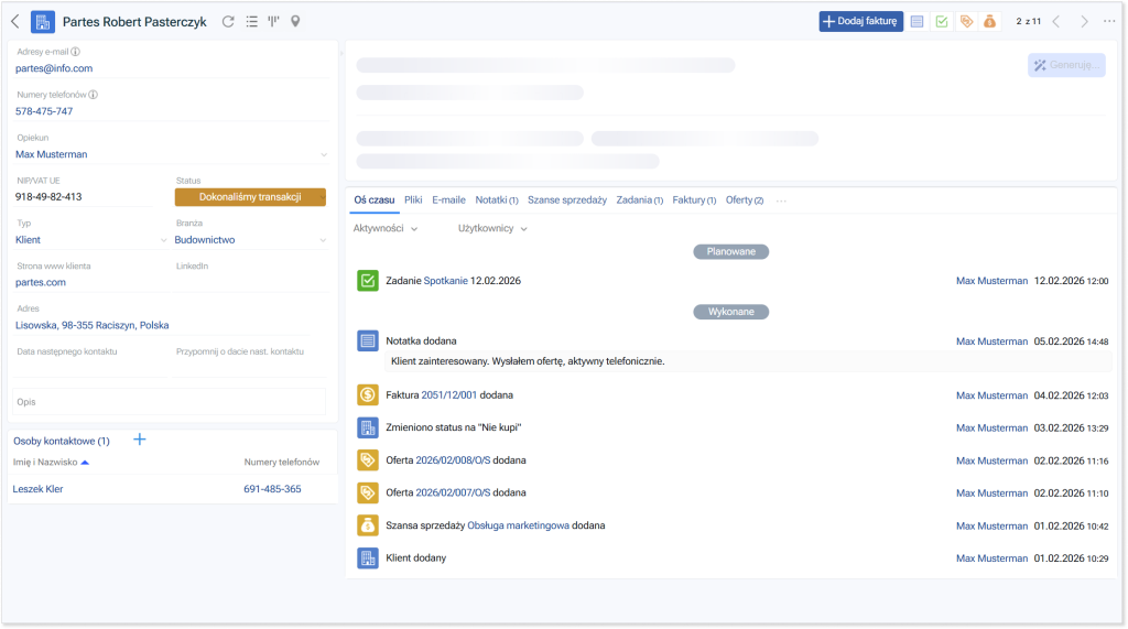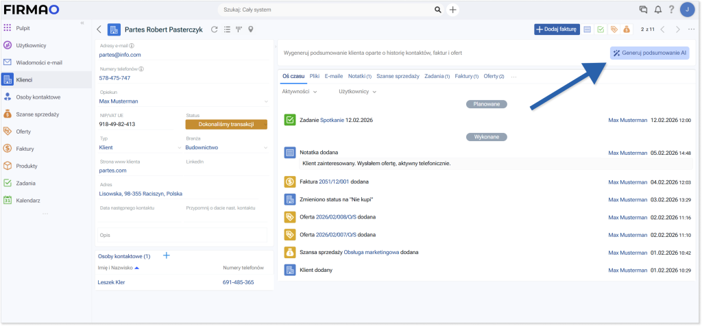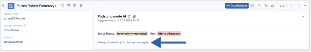 Aby wygenerować podsumowanie działań z klientem, przejdź do widoku szczegółów klienta, u którego takie podsumowanie chcesz utworzyć. Następnie kliknij przycisk „Generuj podsumowanie AI” w prawym górnym rogu.