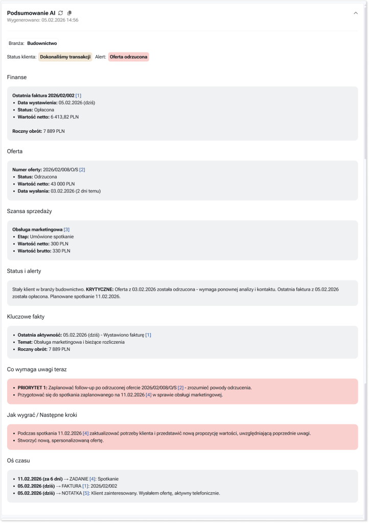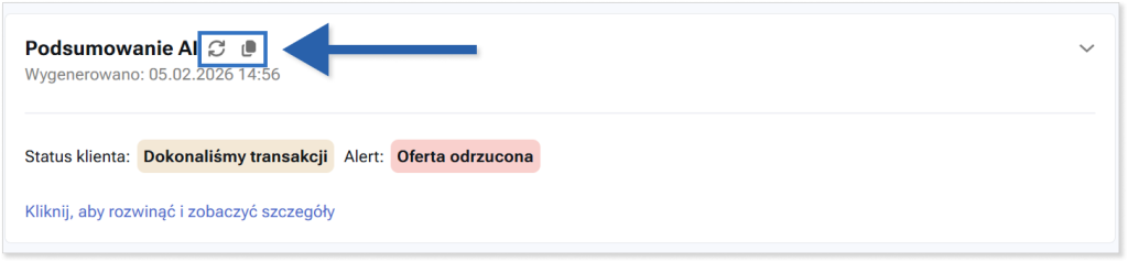 Wygenerowane podsumowanie możesz odświeżać, aby AI wzięło pod uwagę najnowsze aktywności przypisane do klienta. Zrobisz to za pomocą ikony strzałek przy nagłówku podsumowania. Używając ikony obok – dwóch dokumentów – możesz skopiować całe podsumowanie w formie tekstu.