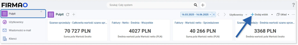W celu skonfigurowania własnego pulpitu w menu głównym kliknij pozycję „Pulpit” w menu głównym, a następnie kliknij przycisk „+ Dodaj widok”.