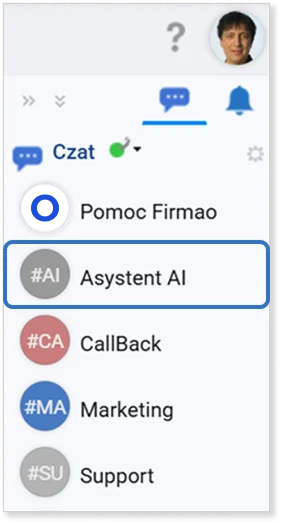 W tym celu zamknij okno Ustawień firmy i wróć do głównego widoku menu. W panelu czatu po prawej stronie pojawi się nowa grupa: Asystent AI.