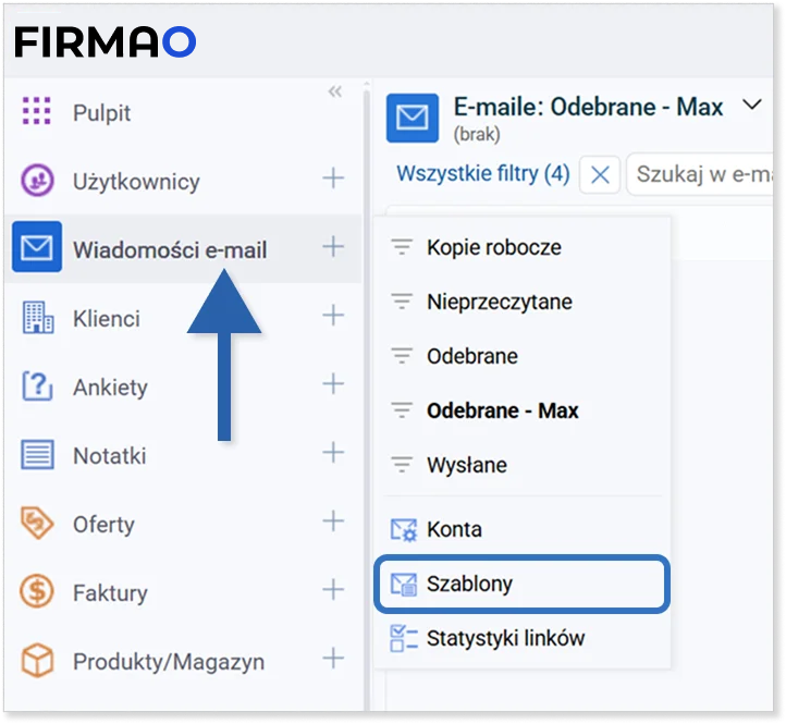 W celu utworzenia lub edytowania już istniejącego szablonu e-mail najedź kursorem myszki na pozycję „Wiadomości e-mail” w menu głównym. Z listy rozwijanej wybierz opcję „Szablony”.