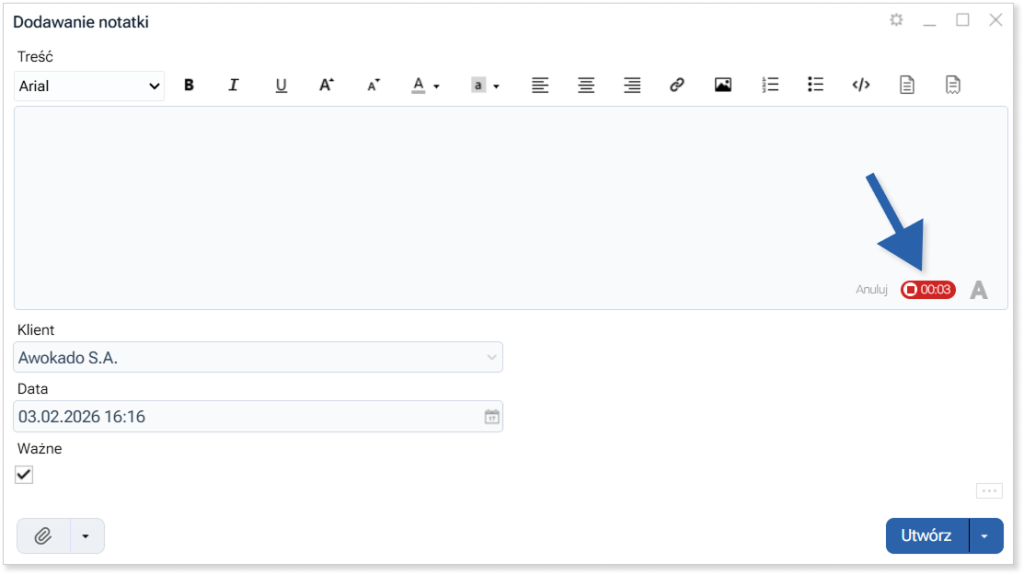 Nagrywanie głosowe możesz włączyć w oknie dodawania notatki lub jej edycji. O tym, jak dodać notatkę lub przejść do jej szczegółów, przeczytasz tutaj.