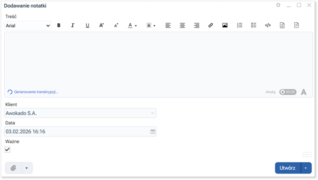 Funkcja transkrypcji notatek głosowych umożliwia szybkie tworzenie notatek tekstowych na podstawie nagrania głosowego. Zamiast wpisywać treść ręcznie, wystarczy nagrać wypowiedź, a system automatycznie przekształci ją w tekst przy użyciu technologii AI.