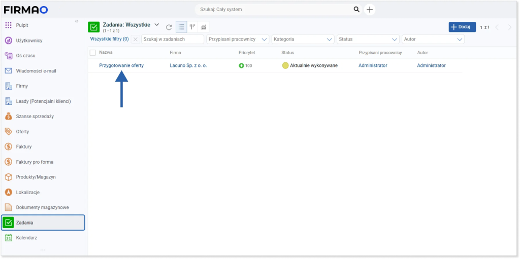 W pierwszej kolejności klikamy moduł „Zadania” w menu głównym, a następnie klikamy nazwę zadania, którego finanse chcemy zdefiniować.